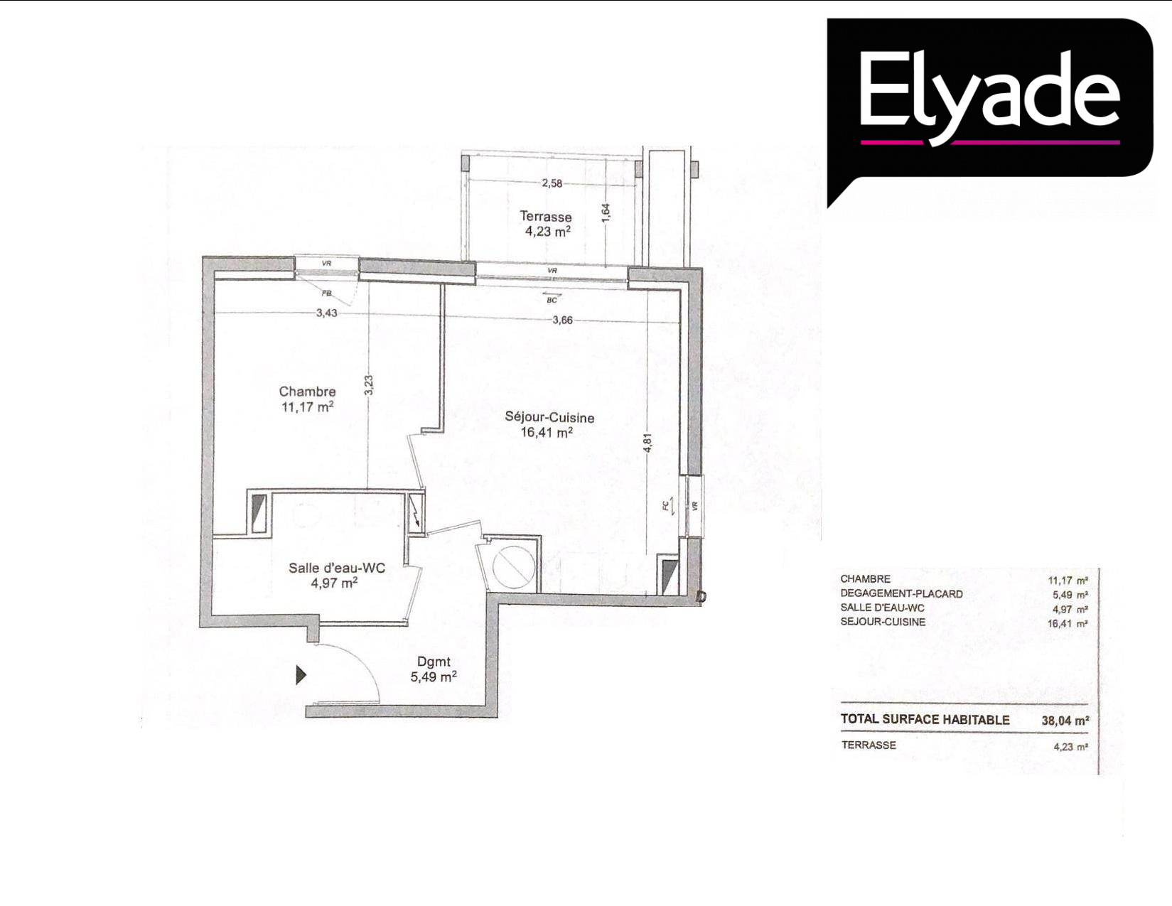Sa surface habitable est d'environ 38 m². Il comprend un séjour cuisine ouvrant sur une terrasse de 4 m² en exposition Nord-Est, une chambre confortable, salle d'eau avec WC.