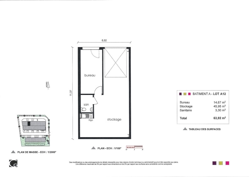 Le local d'une superficie de 62.92m² dispose d'un bureau climatisé de 14.67m² équipé de prise RG45 , d'un espace de stockage de 45.95 m²avec porte sectionnelle motorisé et d'un espace sanitaire.