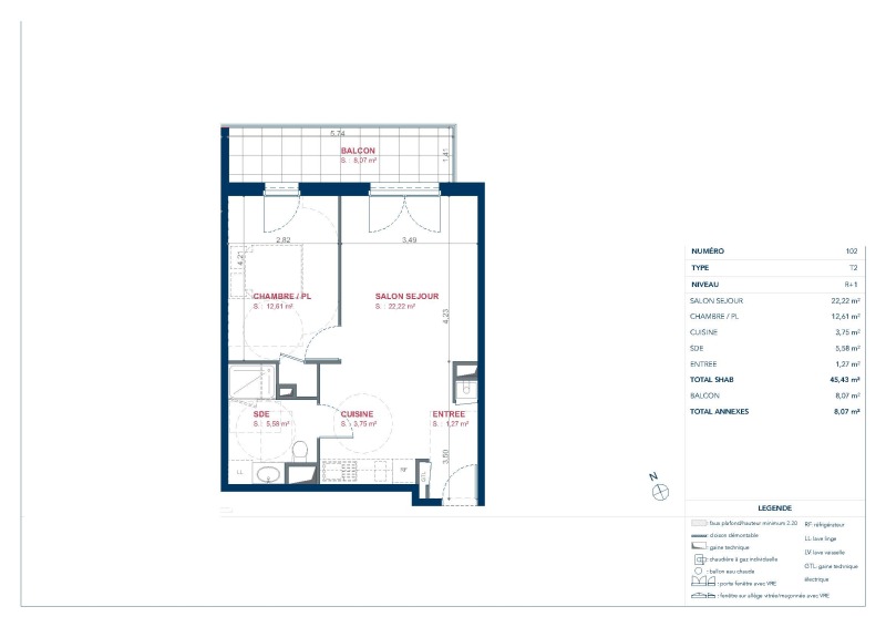 Appartement 2 pièces 45.43m²