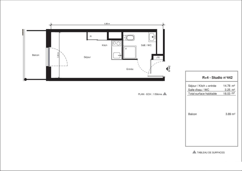 Il est composé d'une entrée, d'une pièce de vie avec cuisine équipée (évier inox, plaque 2 feux, hotte, meubles hauts et bas,frigo table top,), d'une salle d'eau aménagée avec WC, d'un balcon de 3.89m².