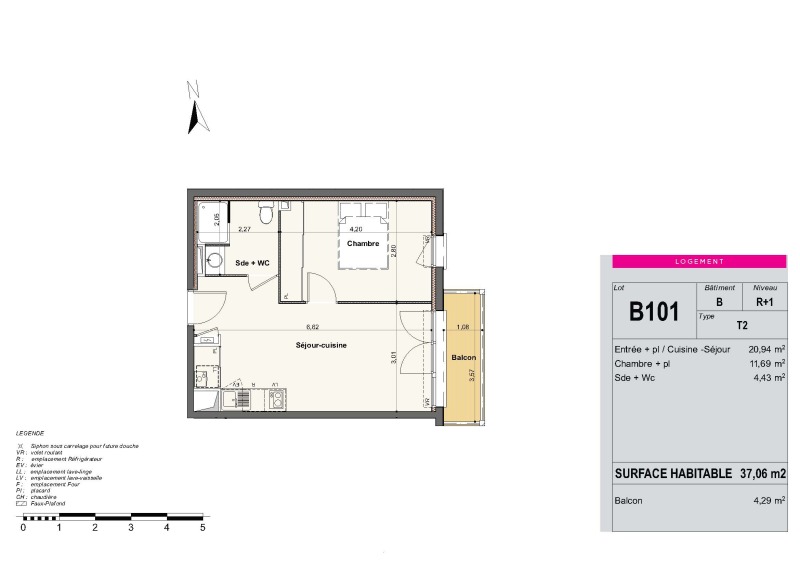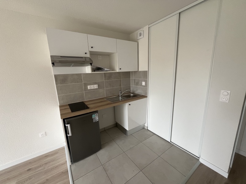 Il est composé d'une entrée, d'un séjour avec cuisine équipée (évier inox, plaque 2 feux, hotte, meubles hauts et bas, frigo top), d'une chambre avec placard, d'une salle d'eau aménagée avec WC, d'un balcon de 4.29m². Il bénéficie d'un parking en sous-sol.