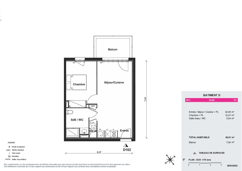 Il est composé d'un séjour avec cuisine équipée (évier inox, plaque 2 feux, hotte, meubles hauts et bas, frigo top), d'une chambre avec placard, d'une salle d'eau aménagée avec WC, d'un balcon de 7.00m² et . Il bénéficie d'un parking aérien.