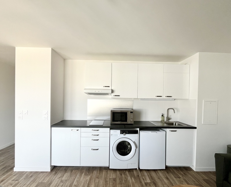 Ce studio fonctionnel à la décoration tendance comprend une entrée accueillante, un séjour lumineux avec une cuisine équipée (meubles hauts et bas, évier, plaque vitrocéramique, micro-onde/four, machine à laver) pour un confort optimal ainsi qu'une salle de bain aménagée avec WC, parfaite pour répondre à vos besoins.