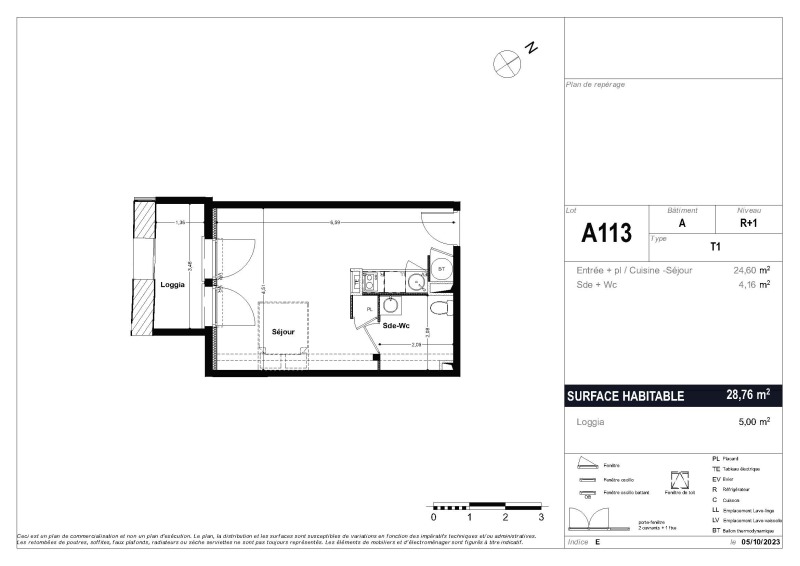 Il est composé d'un séjour avec cuisine équipée (Meubles hauts et bas, un évier, plaque vitrocéramique 2 feux, une hotte, frigo top), d'une chambre, d'une salle d'eau aménagée avec WC , et d'une loggia de 5m². Il bénéficie d'une place de parking exterieur.