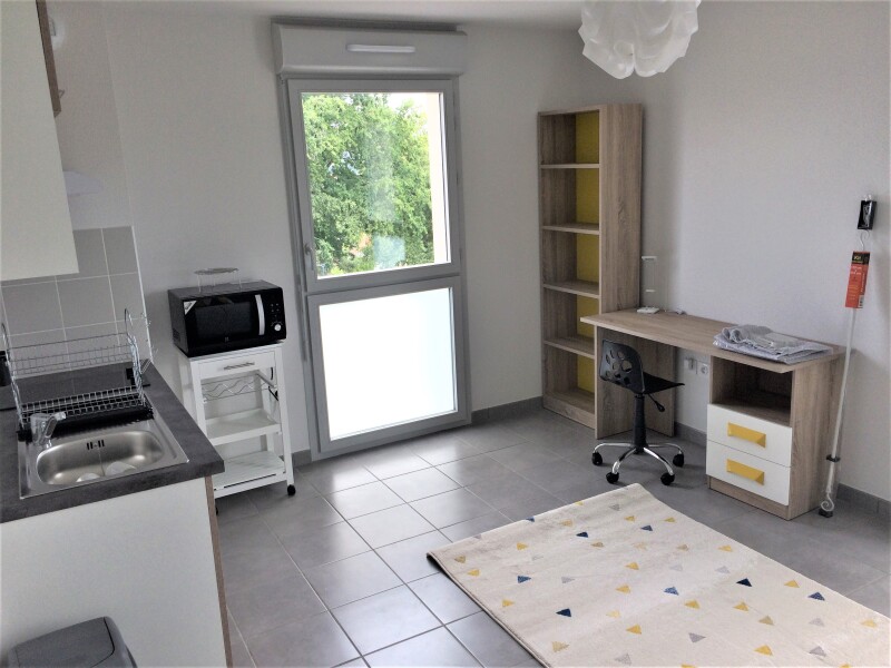 Votre studio meublé, avec entrée, cuisine équipée (évier inox, plaque 2 feux, hotte, réfrigérateur table top, meubles hauts et bas), séjour, salle d'eau aménagée avec WC, placards aménagés, (un tapis, un bureau, une table basse, une chaise de bureau, une étagère, un luminaire, un four à micro-ondes, vaisselle, ustensile de cuisine, matériel d'entretien ménager.)