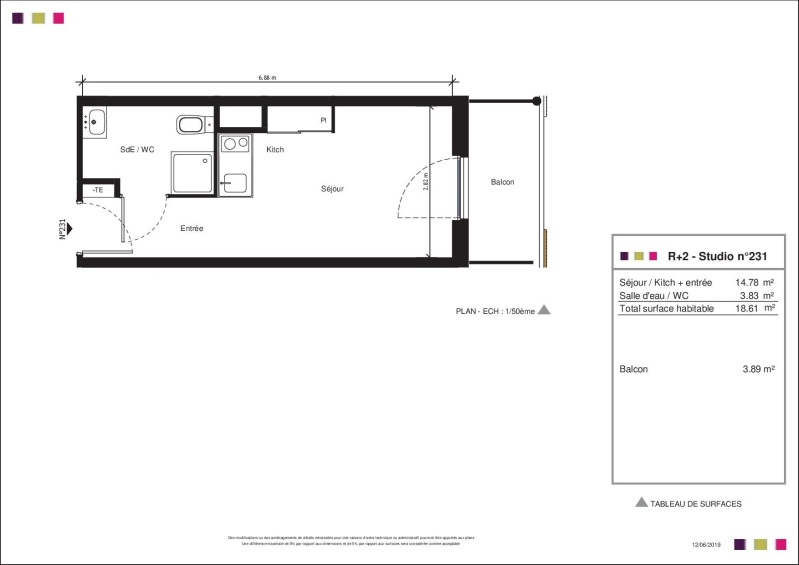 Il est composé d'une entrée, d'une pièce de vie avec cuisine équipée (évier inox, plaque 2 feux, hotte, meubles hauts et bas,frigo table top,), d'une salle d'eau aménagée avec WC, d'un balcon de 3.89m² et d'une place de parking en aérien.