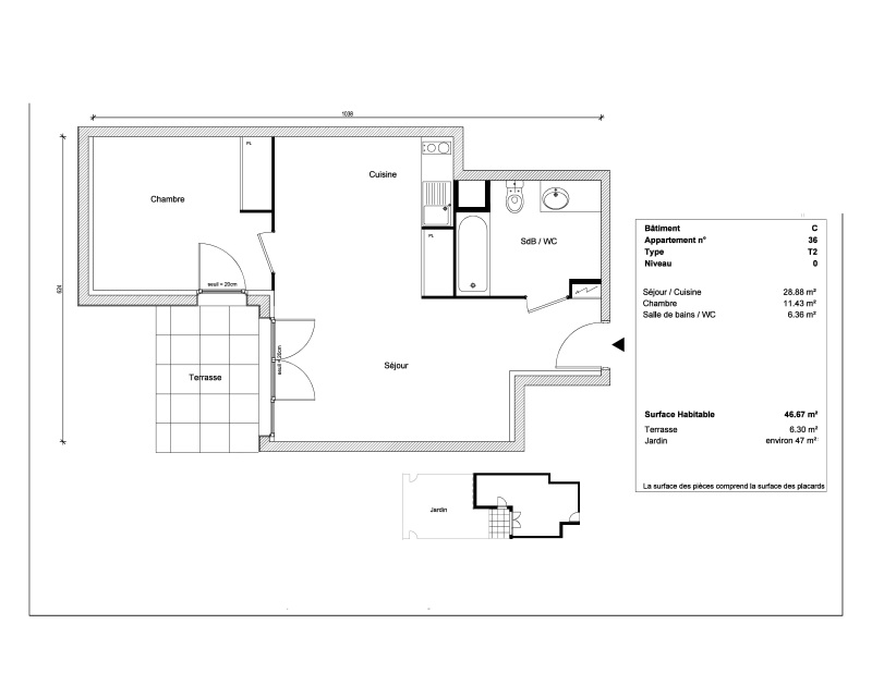 Il se composé d'une entrée, d'un séjour avec cuisine équipée (Meubles hauts et bas, un évier, plaque 2 feux, une hotte, un réfrigérateur table top) s'ouvrant sur une terrasse de 6.30m² avec son jardin de 47m² , d'une chambre avec placard, d'une salle de bain aménagée d'un wc et équipée d'une machine à laver.