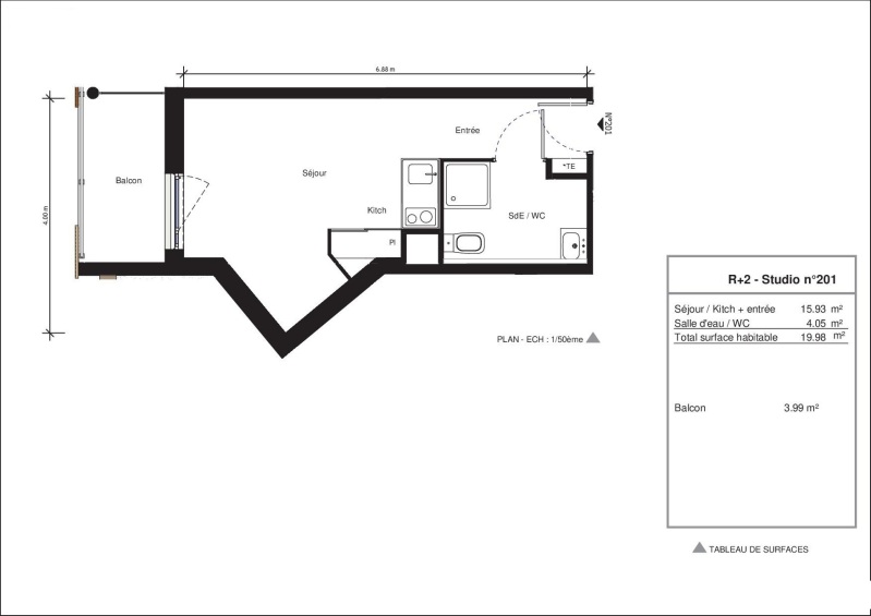 Il est composé d'une entrée, d'une pièce de vie avec cuisine équipée (évier inox, plaque 2 feux, hotte, meubles hauts et bas,frigo table top,), d'une salle d'eau aménagée avec WC, d'un balcon de 3.99m². Il bénéficie d'une place extérieure.