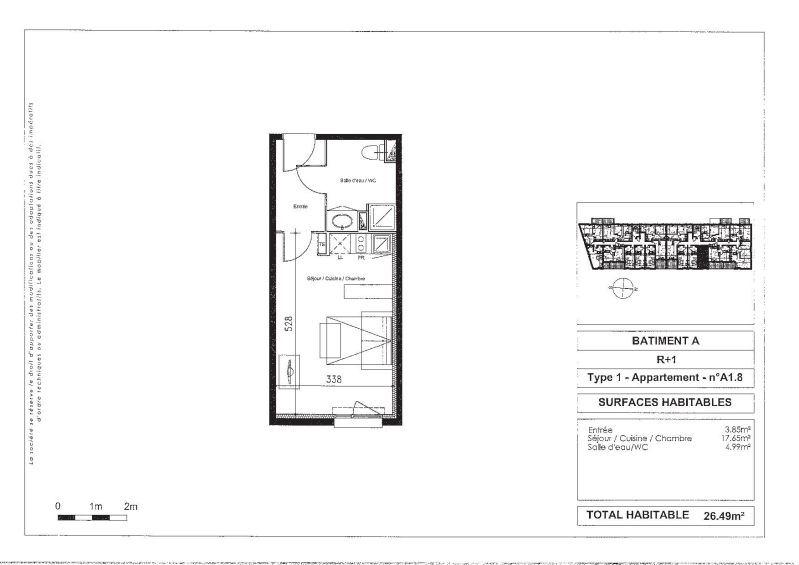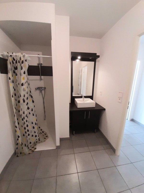 Il se compose d'une entrée avec placard équipé, d'une pièce principale avec cuisine équipée (évier, meubles hauts et bas, plaque 2 feux vitrocéramique, hotte aspirante, réfrigérateur table TOP), salle d'eau aménagée,