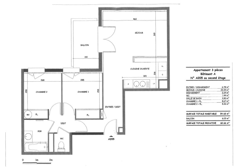 Il est composé d'une entrée, d'un séjour avec cuisine équipée d'un évier, de deux chambres avec placard, d'une salle de bain aménagée, d'un WC séparé, et d'un balcon de 6.03m². Il bénéficie d'une place de parking en sous-sol ainsi qu'un cellier.