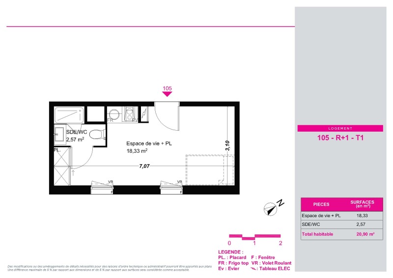 Il est composé d'une entrée, d'une pièce à vivre avec cuisine équipée (évier inox, plaque 2 feux, hotte, meubles hauts et bas, réfrigérateur table top), d'une salle d'eau aménagée avec WC. Il bénéficie d'un parking sous-sol