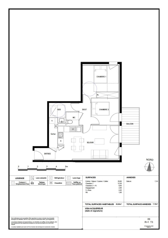 Il est composé d'une entrée, d'un séjour avec cuisine équipée (meubles haut et bas - hotte aspirante - plaque de cuisson vitrocéramique 3 feux - évier inox), d'un cellier, de deux chambres dont une avec placard, d'une salle d'eau aménagée et d'un WC séparé, d'un balcon de 7.10m²
