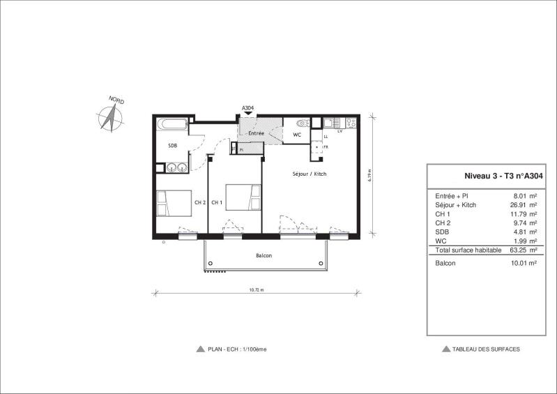 Appartement 3 pièces 63.25m²