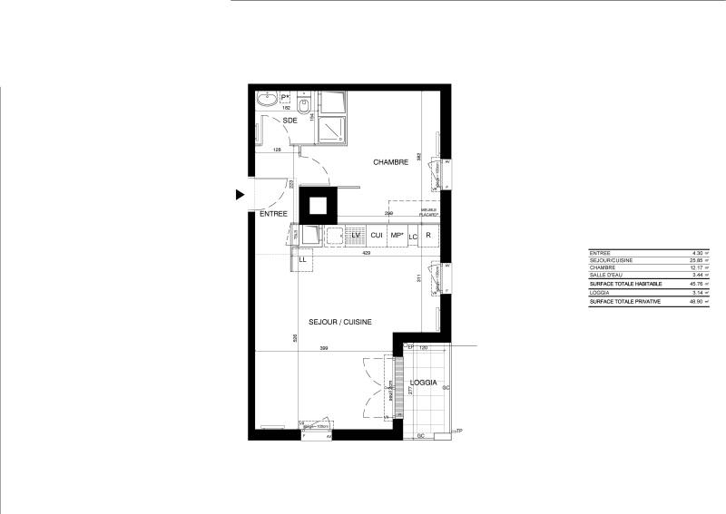 Il est composé d'une entrée, d'une pièce à vivre avec cuisine équipée, d'une chambre avec placard, d'une salle d'eau aménagée avec WC, d'une loggia de 3.14m². Il bénéficie d'un parking sous sol.