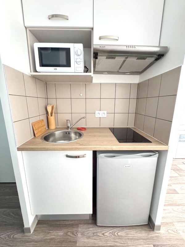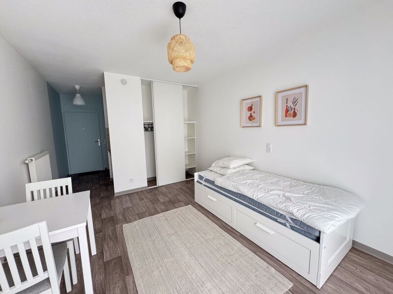 A la location ce studio meublé composé d'une pièce à vivre avec cuisine équipée (évier inox, plaque 2 feux, hotte, meubles hauts et bas, réfrigérateur table top), d'une salle d'eau aménagée avec WC.