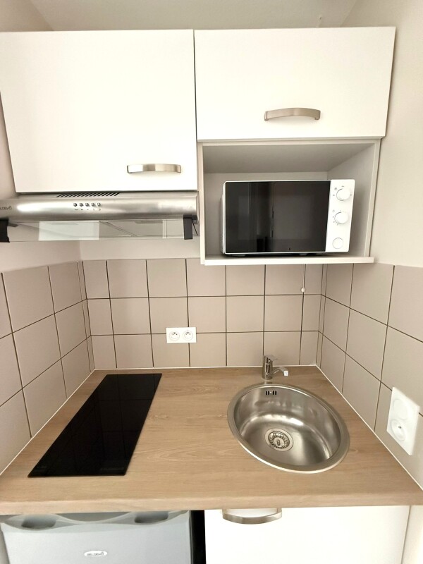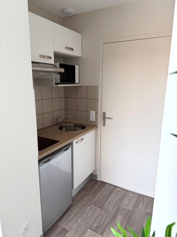 ce logement est composé d'une pièce à vivre avec cuisine équipée (évier inox, plaque 2 feux, hotte, meubles hauts et bas, réfrigérateur table top), d'une salle d'eau aménagée avec WC. Une place de parking en exterieur, complète ce bien.