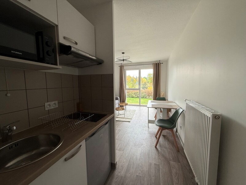 STUDIO composé d'une pièce à vivre avec cuisine équipée (évier inox, plaque 2 feux, hotte, meubles hauts et bas, réfrigérateur table top), d'une salle d'eau aménagée avec WC.