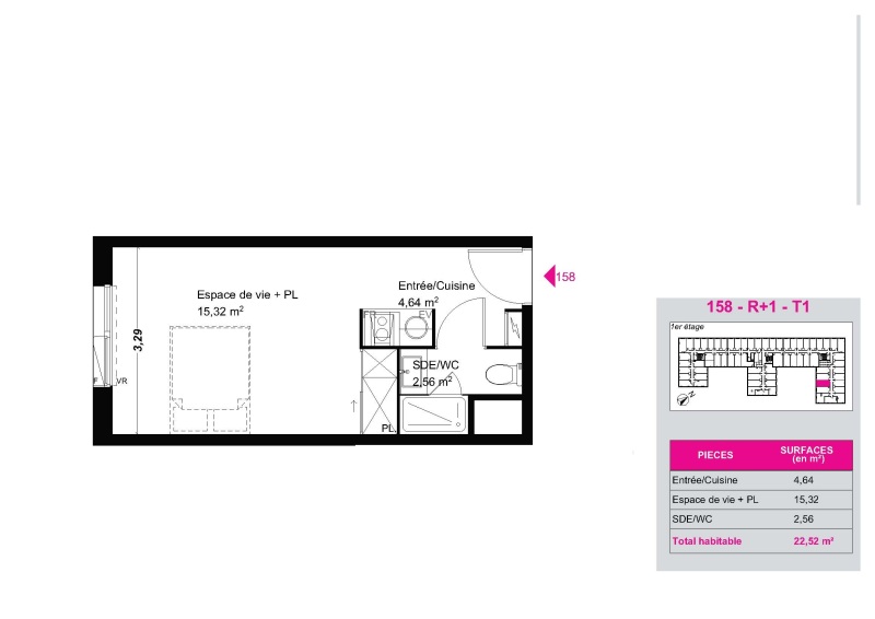 STUDIO MEUBLE composé d'une pièce à vivre avec cuisine équipée (évier inox, plaque 2 feux, hotte, meubles hauts et bas, réfrigérateur table top), d'une salle d'eau aménagée avec WC.