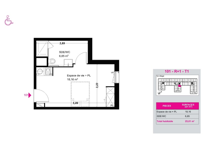 Il est composé d'une pièce à vivre avec cuisine équipée (évier inox, plaque 2 feux, hotte, meubles hauts et bas, réfrigérateur table top), d'une salle d'eau aménagée avec WC.