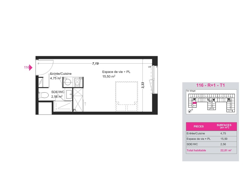 Il est composé d'une entrée, d'une pièce à vivre avec cuisine équipée (évier inox, plaque 2 feux, hotte, meubles hauts et bas, réfrigérateur table top), d'une salle d'eau aménagée avec WC.