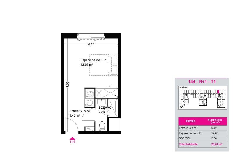 Studio composé d'une entrée, d'une pièce à vivre avec cuisine équipée (évier inox, plaque 2 feux, hotte, meubles hauts et bas, réfrigérateur table top), d'une salle d'eau aménagée avec WC. Un cellier complète ce bien.