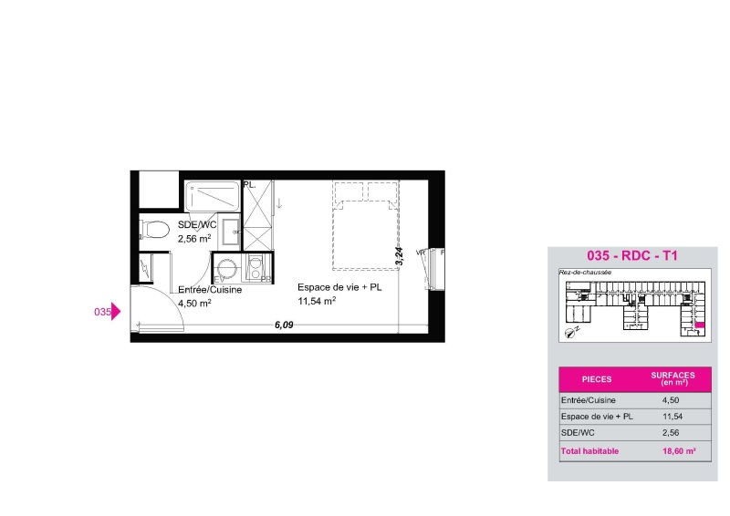 Il est composé d'une entrée, d'une pièce à vivre avec cuisine équipée (évier inox, plaque 2 feux, hotte, meubles hauts et bas, réfrigérateur table top), d'une salle d'eau aménagée avec WC.