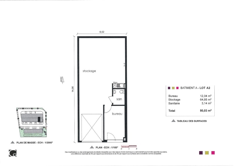 Le local d'une superficie de 80m² dispose d'un bureau climatisé de 12.04 m² équipé de prise RG45, d'une zone de stockage de 64.85 m² et d'un espace sanitaire.
