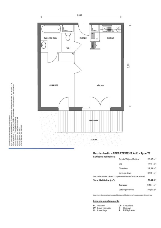 Il se compose d'une entrée, d'un séjour lumineux ouvrant sur la terrasse et du jardin privatif de 36m² , d'une cuisine ouverte aménagée / équipée (évier inox, plaque 2 feux, hotte, meubles hauts et bas, frigo top), d'une chambre avec placard ouvrant sur la terrasse, d'une salle de bains aménagée et d'un WC séparé.