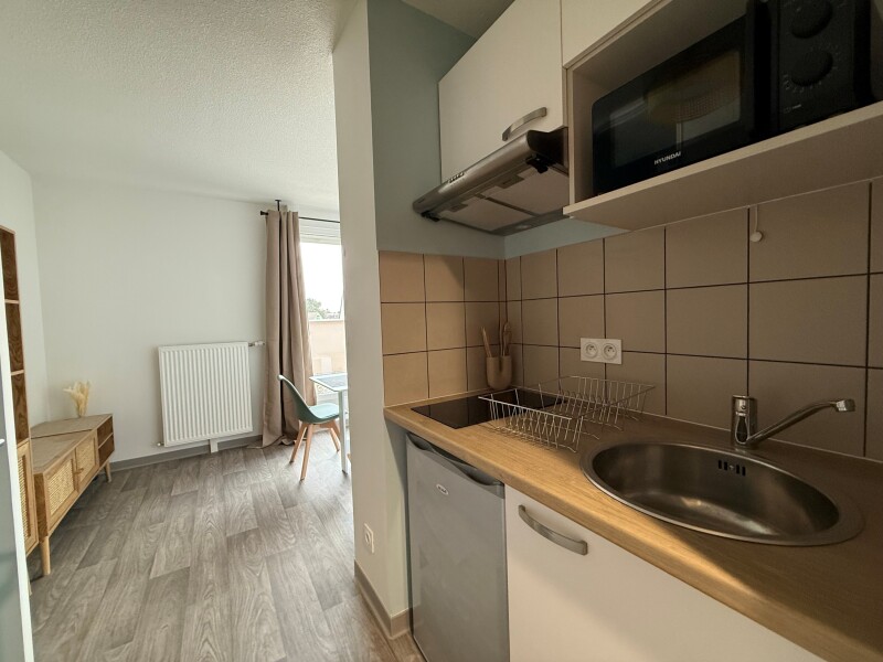 Il est composé d'une entrée, d'une pièce à vivre avec cuisine équipée (évier inox, plaque 2 feux, hotte, meubles hauts et bas, réfrigérateur table top), d'une salle d'eau aménagée avec WC . Il bénéficie d'un parking extérieur.