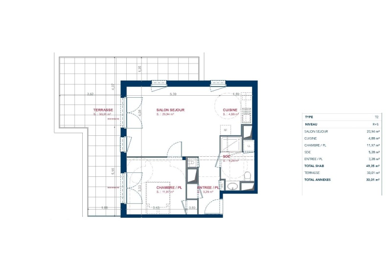 Agréable T2 situé au 5ème étage avec belle et grande terrasse de 30m² dans une résidence neuve.