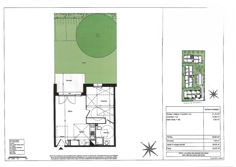 Il est composé d'une entrée, d'un séjour avec cuisine équipée (meubles hauts et bas, hotte aspirante, plaque votrocéramique 2 feux, frigo table top) s'ouvrant sur une terrasse de 7m² avec son jardin privatif de 28 m² , d'une chambre avec placard et d'une salle d'eau avec wc.