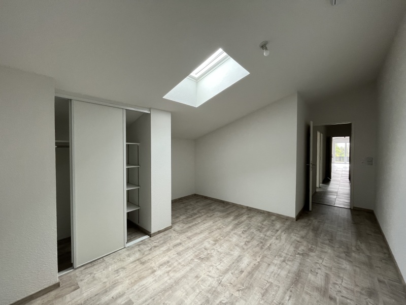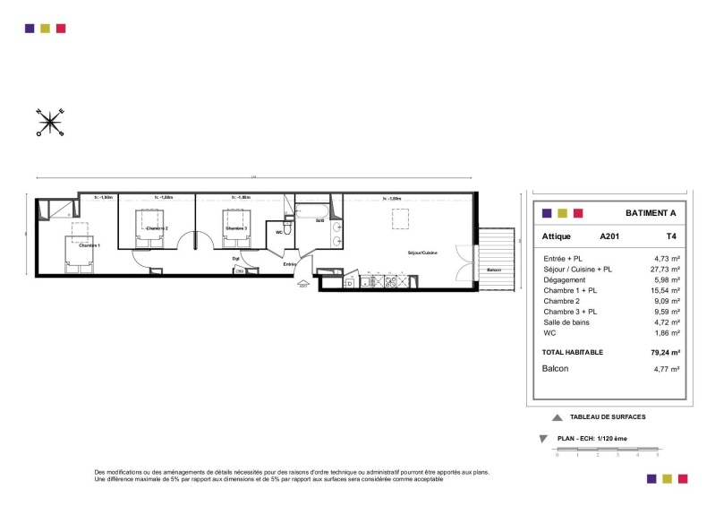 Il est composé d'une entrée, d'un séjour avec cuisine équipée (évier inox, plaque 4 feux, hotte, meubles hauts et bas), de trois chambres dont deux avec placard, d'une salle de bains aménagée et d'un WC séparé,d'un balcon de 4.77m². Il bénéficie de deux places deparking aérien.