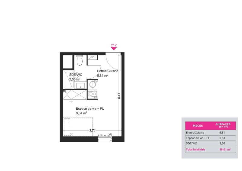 Il est composé d'une entrée, d'une pièce à vivre avec cuisine équipée (évier inox, plaque 2 feux, hotte, meubles hauts et bas, réfrigérateur table top), d'une salle d'eau aménagée avec WC .