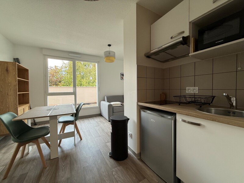 STUDIO MEUBLE composé d'une entrée avec placard, d'une pièce à vivre avec cuisine équipée (évier inox, plaque 2 feux, hotte, meubles hauts et bas, réfrigérateur table top), d'une salle d'eau aménagée avec WC .