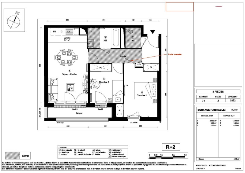 meuble télévision ouvert sur un balcon de 5.40m², d'une cuisine équipée (meubles hauts et bas, évier, cuisinière éléctrique, hotte, réfrigérateur), d'une première chambre avec un lit en140, table de chevet et dressing, d'une deuxième chambre avec un lit en 90, table de chevet et dressing, d'une salle de bains aménagée et d'un WC séparé.
