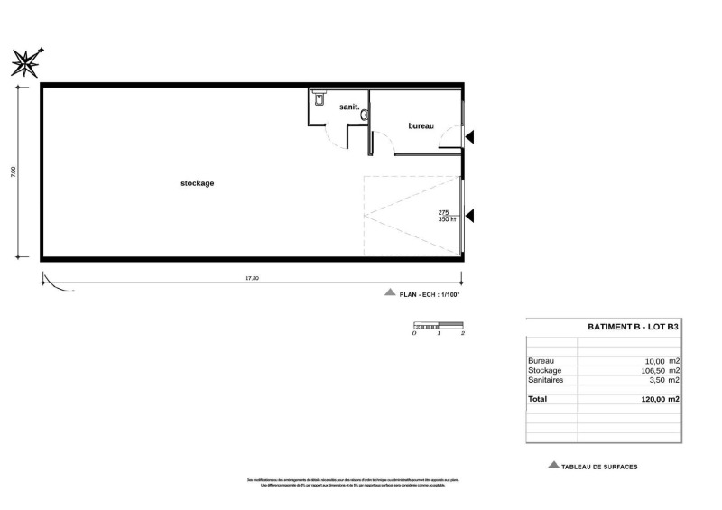 Le local d'une superficie de 120m² dispose d'un bureau climatisé, d'un espace de stockage avec porte sectionnelle motorisé et d'un espace sanitaire, équipé de prise RG45.