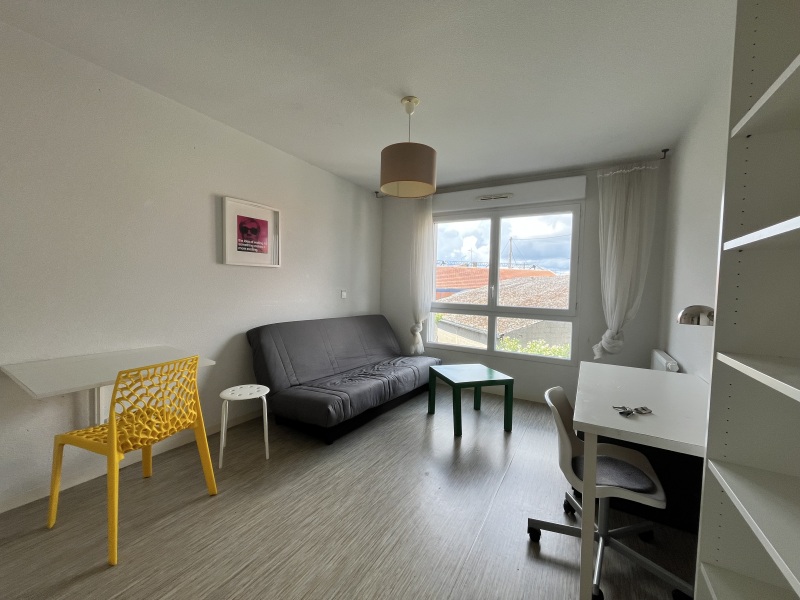 STUDIO MEUBLE : entrée, cuisine équipée avec table et 2 chaises (évier inox, plaque 2 feux, hotte, four micro-ondes, réfrigérateur table top, meubles hauts et bas), séjour avec canapé-lit et table-basse, bureau et objets de décoration, salle d'eau aménagée avec WC et placards, interphone et ascenseur.