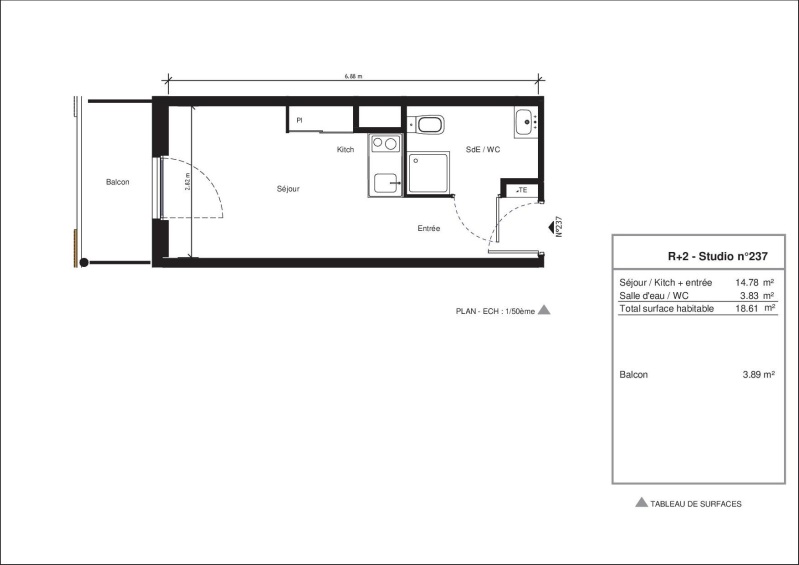Il est composé d'une entrée, d'une pièce de vie avec cuisine équipée, d'une salle d'eau aménagée avec WC, d'un balcon de 3.89m².