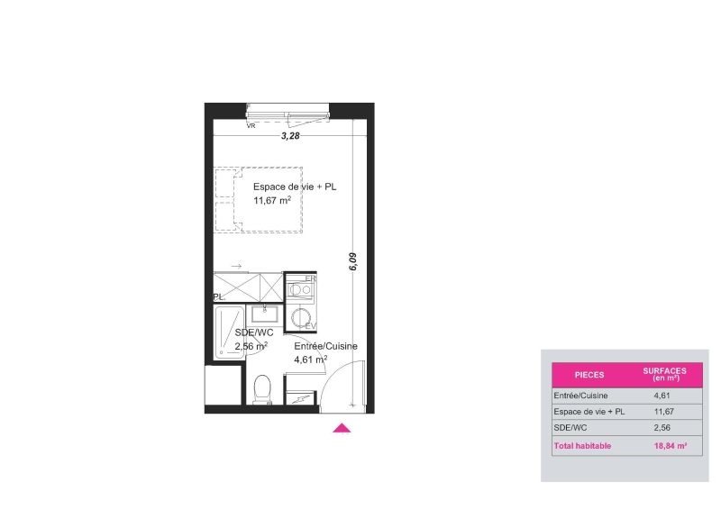 Pièce de vie avec cuisine équipée (plaque, hotte, rangements, frigo), salle d'eau avec WC.