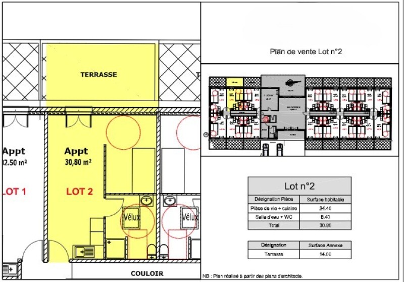 Studio lumineux et climatisé, conçu pour le confort des personnes âgées autonomes. Il se compose d'une entrée, d'une pièce de vie avec cuisine équipée (meubles, évier, plaque, hotte, réfrigérateur top, micro-ondes), d'une salle d'eau avec WC, et d'une grande terrasse de 14 m².