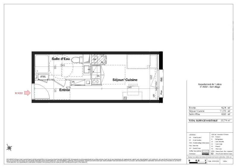 Une pièce à vivre lumineuse avec cuisine équipée (meubles, hotte, évier inox, plaque vitrocéramique 2 feux, frigo table top).Une salle d'eau moderne avec WC.