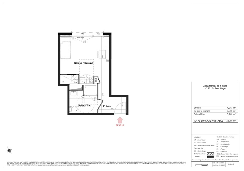 Une pièce à vivre lumineuse avec cuisine équipée (meubles, hotte, évier inox, plaque vitrocéramique 2 feux, frigo table top).Une salle d'eau moderne avec WC.