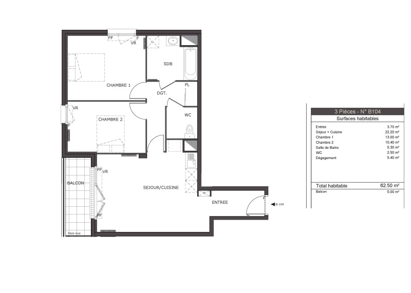 Il est composé d'une entrée, d'un séjour avec cuisine équipée (Evier, meubles haut et bas, plaque 4 feux, hotte aspirante), s'ouvrant sur un balcon de 5.00m² de deux chambres chambre, d'une salle de bain aménagée et d'un WC séparé.