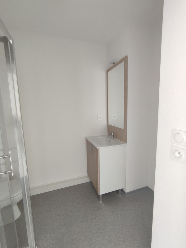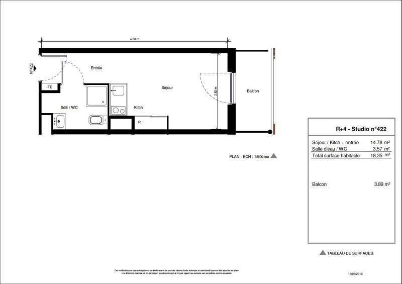 Il est composé d'une entrée, d'une pièce de vie avec cuisine équipée (évier inox, plaque 2 feux, hotte, meubles hauts et bas,frigo table top), d'une salle d'eau aménagée avec WC, d'un balcon de 3.89m².