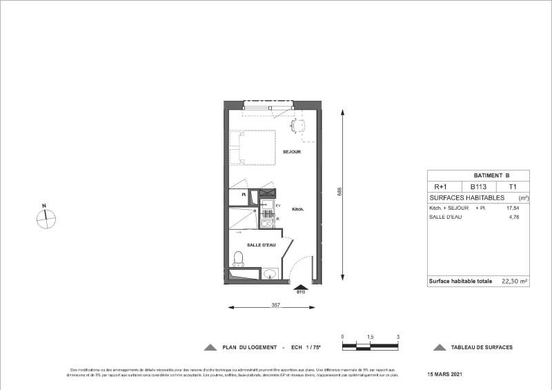 Il est composé d'une entrée, d'une pièce à vivre avec cuisine aménagée (évier inox, plaque 2 feux, hotte, meubles hauts et bas, réfrigérateur table top), d'une salle d'eau aménagée avec WC . Il bénéficie d'un parking sous-sol.