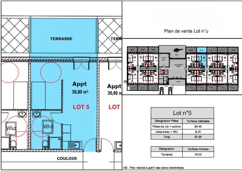 Studio lumineux et climatisé, conçu pour le confort des personnes âgées autonomes. Il se compose d'une entrée, d'une pièce de vie avec cuisine équipée (meubles, évier, plaque, hotte, réfrigérateur top, micro-ondes), d'une salle d'eau avec WC, et d'une grande terrasse de 14 m².