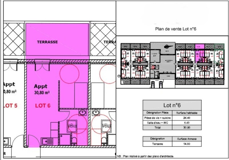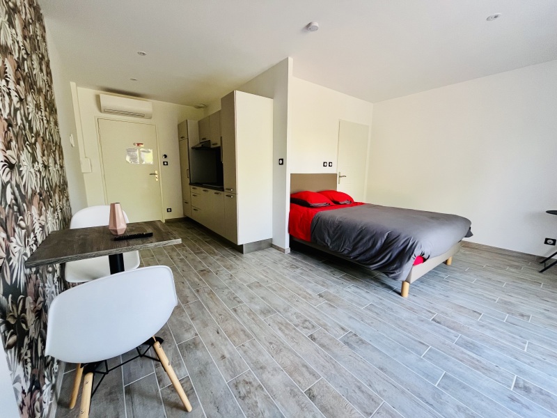 Studio lumineux et climatisé, conçu pour le confort des personnes âgées autonomes. Il se compose d'une entrée, d'une pièce de vie avec cuisine équipée (meubles, évier, plaque, hotte, réfrigérateur top, micro-ondes), d'une salle d'eau avec WC, et d'une grande terrasse de 14 m².