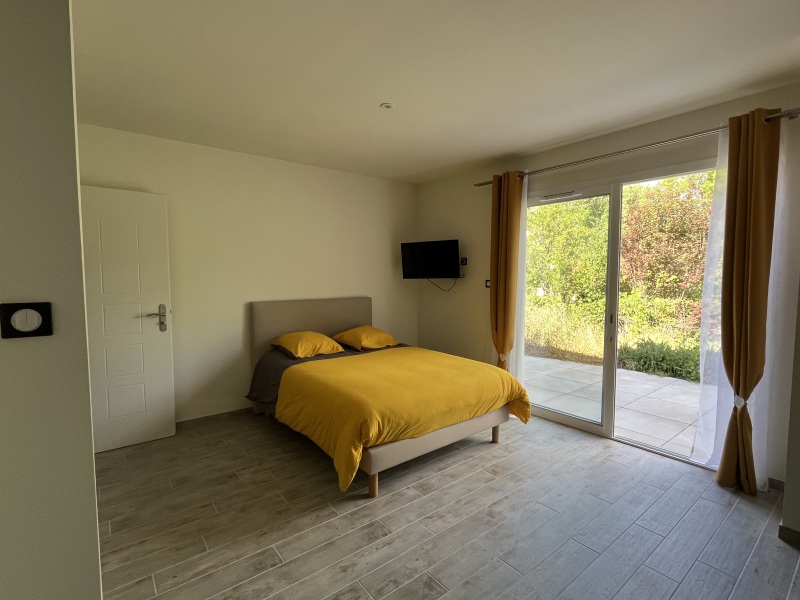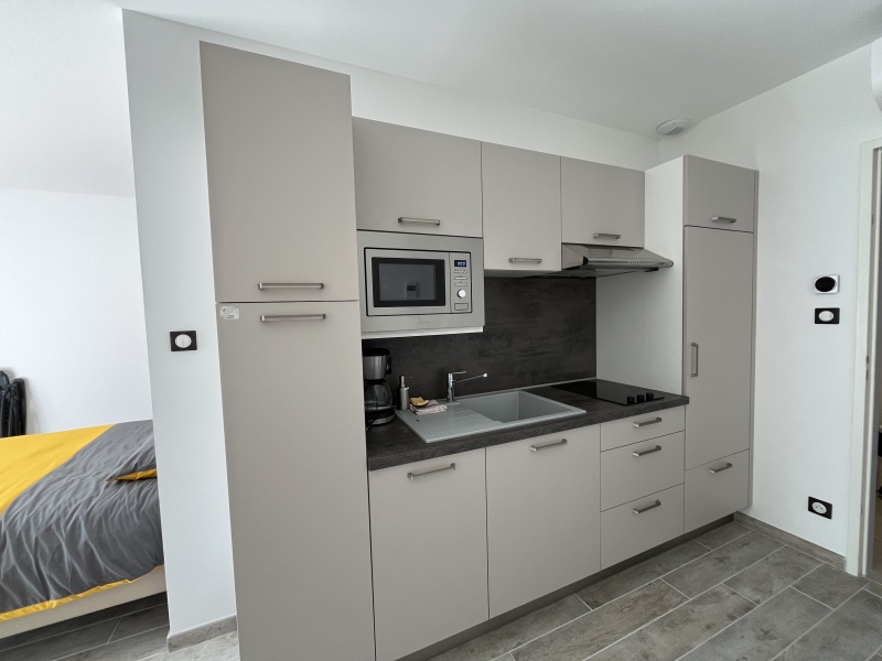 Studio lumineux et climatisé, conçu pour le confort des personnes âgées autonomes. Il se compose d'une entrée, d'une pièce de vie avec cuisine équipée (meubles, évier, plaque, hotte, réfrigérateur top, micro-ondes), d'une salle d'eau avec WC, et d'une grande terrasse de 14 m².