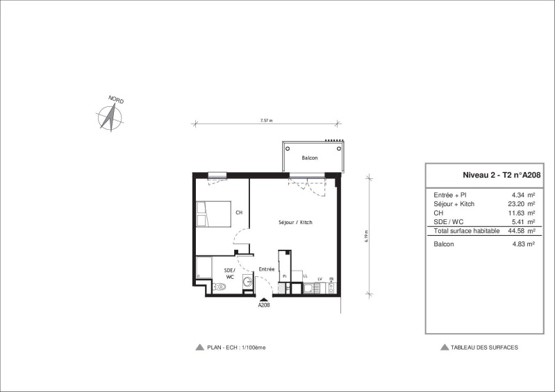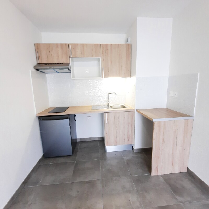 Agréable T2 composé d'une entrée, d'un séjour avec cuisine équipée (évier inox, plaque 2 feux, hotte, meubles hauts et bas, frigo top), d'une chambre, d'une salle d'eau aménagée avec WC, d'un balcon de 4.83m². Il bénéficie d'un parking couvert.
