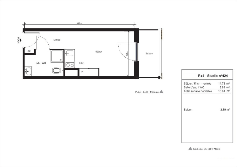 ll est composé d'une entrée, d'une pièce de vie avec cuisine équipée (évier inox, plaque 2 feux, hotte, meubles hauts et bas,frigo table top,), d'une salle d'eau aménagée avec WC, d'un balcon de 3.89m².